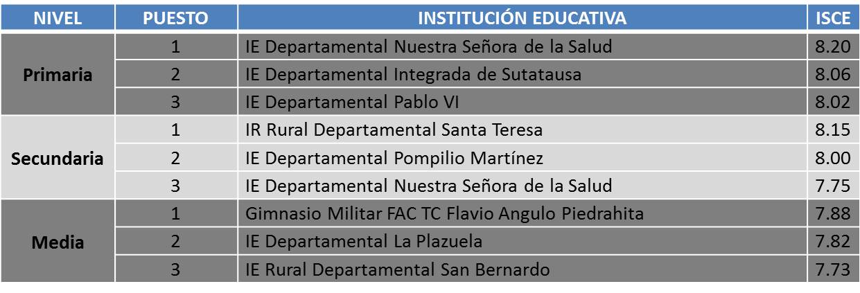 - SECUNDARIA: El departamento mostró un aumento de 0,13 puntos (ISCE) en comparación el año pasado, al pasar de 5,51 en 2015 a 5,64 en 2016.