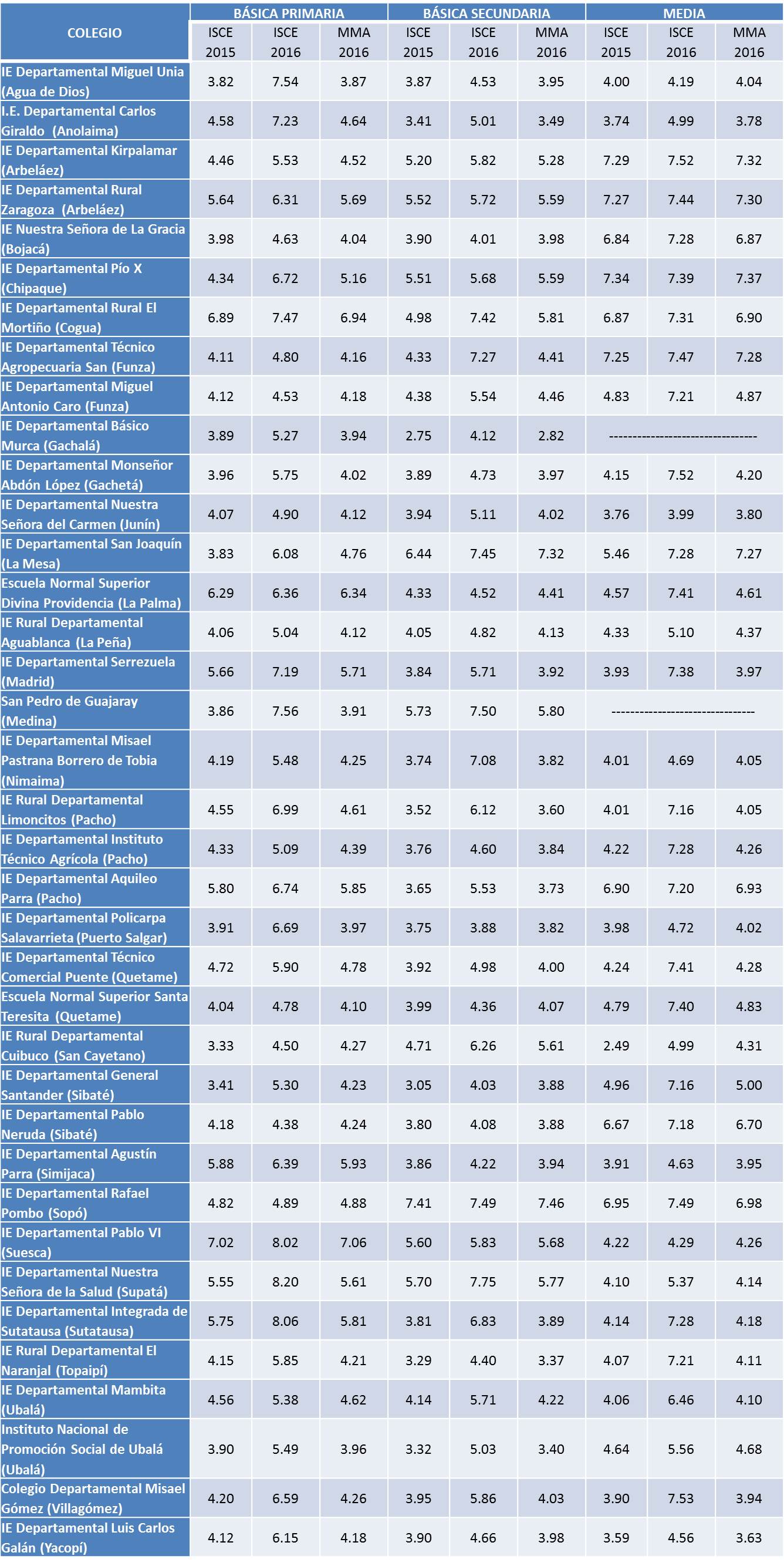 - PRIMARIA: Cundinamarca tuvo una mejora de 0,26 puntos (ISCE) en comparación con el año anterior, al pasar de 5,45 en 2015 a 5,71 en 2016.