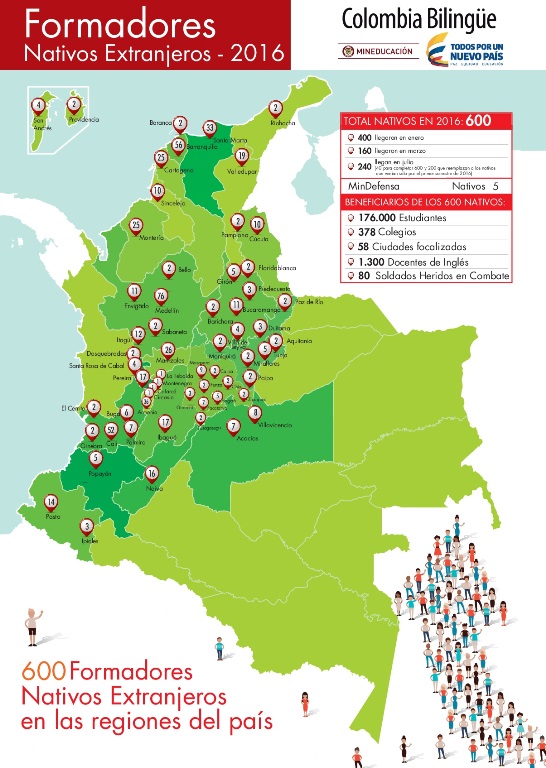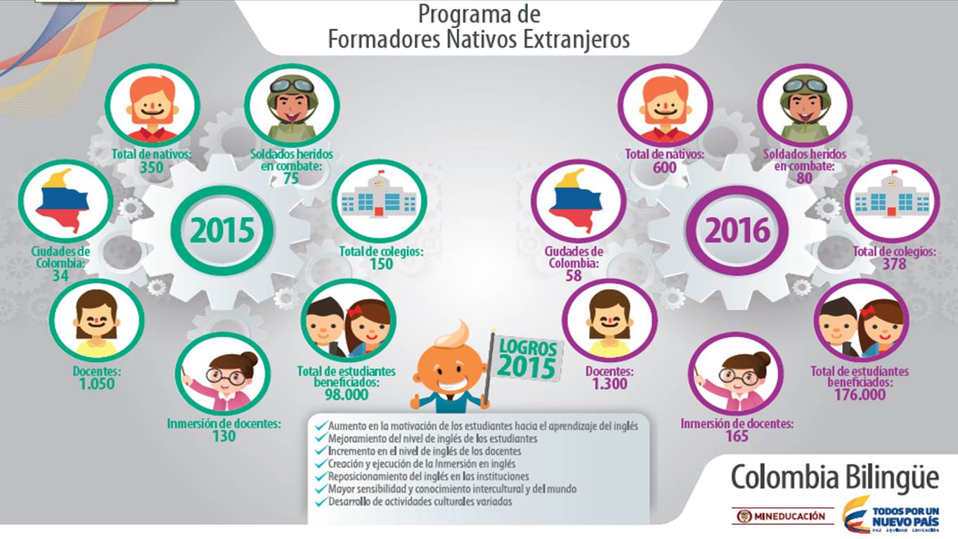 La estrategia se viene implementando desde el 2015, año en el que 350 nativos acompañaron el proceso de 98.000 estudiantes de los grados 9º y 10º, y fortalecieron la labor de 1.050 docentes de inglés colombianos. Este año se busca seguir aumentando la motivación por el aprendizaje del inglés y mejorar el nivel de comunicación tanto de docentes como de estudiantes.