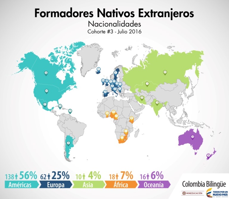 Los 240 nativos son provenientes de Estados Unidos, Reino Unido, Canadá, Ghana, Irlanda, Nigeria, Kenia, Jamaica, República Checa, Nueva Zelanda, Italia, India, España, Alemania, Irán, México, Suiza, Trinidad y Tobago, Argentina, Camerún, Holanda, Islandia, Kazajstán, Serbia, Eslovaquia, Sudáfrica, Suecia y Zimbabue. La inversión para el proyecto realizado entre el Ministerio de Educación, La Corporación Volunteers Colombia y la Fundación Heart For Change es de 25.200 millones de pesos ($25.253.670.350).