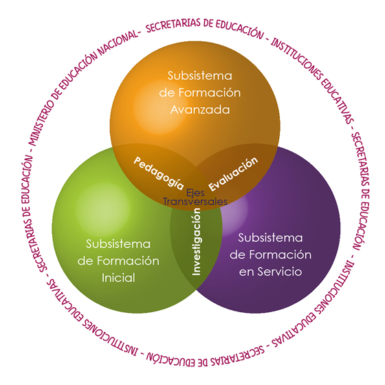 El Sistema de formación de educadores posibilita la articulación de los subsistemas de formación inicial, en servicio y avanzada, para que desde la autonomía de las instituciones formadoras de docentes, las secretarías de educación, los establecimientos educativos, los gremios y los maestros, se avance en el desarrollo de estrategias de formación efectivas para el fortalecimiento de las competencias básicas y profesionales de los futuros docentes y de los educadores en servicio. Además de los tres subsistemas, se definen tres ejes transversales que articulan y potencian el sistema como un todo y desde cada subsistema, según las especificidades que toman tales ejes en cada uno de ellos.