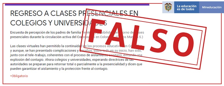 Bogotá. D.C., mayo 22 de 2020. El Ministerio de Educación Nacional se permite informar a la comunidad en general que está circulando por diferentes medios digitales como WhatsApp, correo electrónico, así como en redes sociales una encuesta de percepción sobre el regreso a clases presenciales en colegios y universidades, la cual no fue elaborada por el Ministerio.