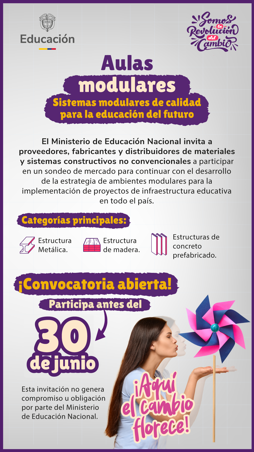 El Ministerio de Educación te invita a participar en un sondeo de mercado para continuar avanzando en el desarrollo de la estrategia de ambientes modulares y la implementación de proyectos de infraestructura educativa en todo el país.