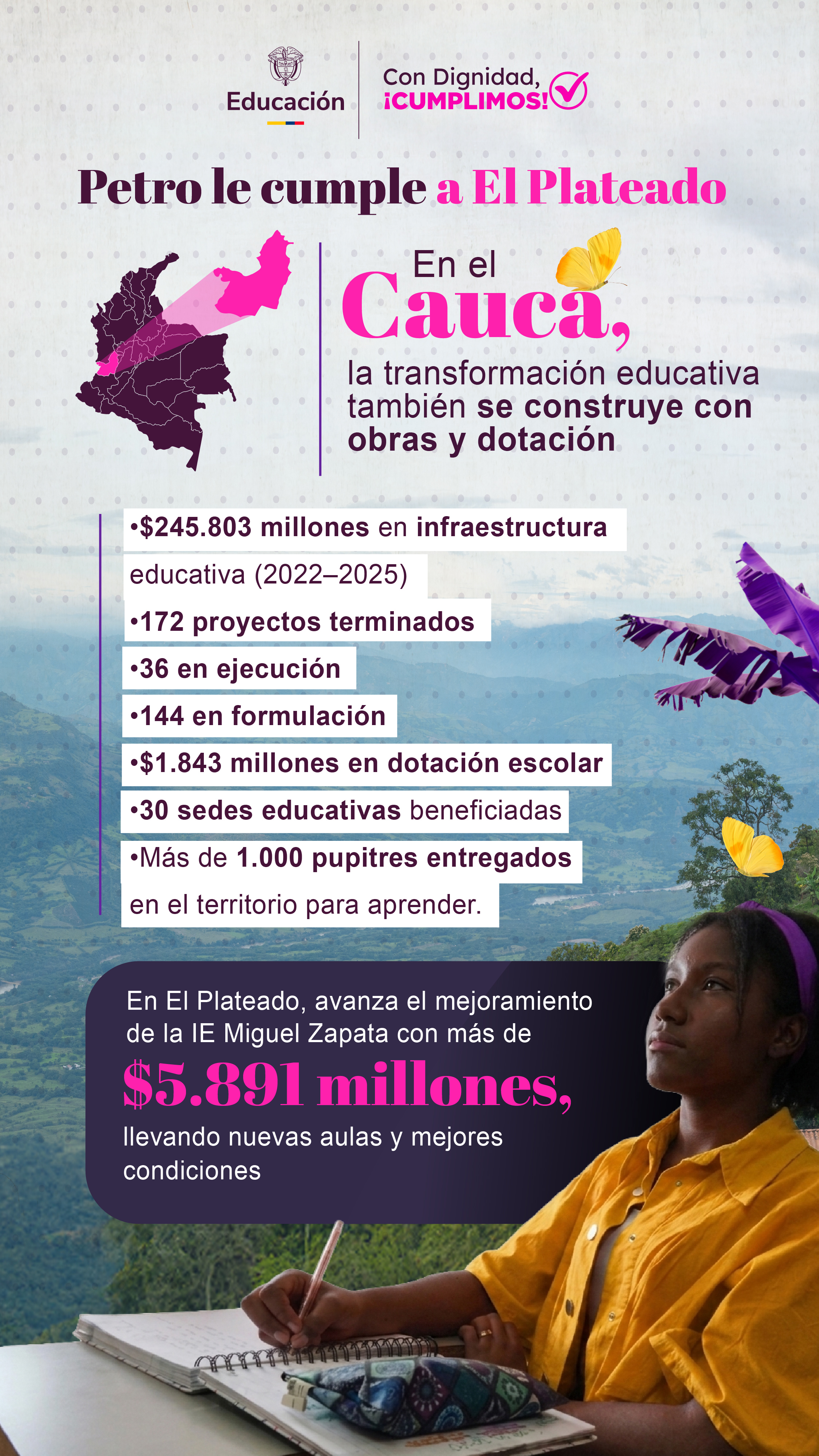 En el Cauca, la infraestructura educativa se fortalece de manera integral. Entre 2022 y 2025, se han invertido más de $245.803 millones en la construcción, mejoramiento y adecuación de sedes educativas, con 172 proyectos terminados que ya benefician a más de 39.000 estudiantes, además de obras en ejecución y formulación que continúan cerrando brechas en zonas rurales y dispersas. Esta apuesta se complementa con procesos de dotación escolar, que mejoran los ambientes de aprendizaje y fortalecen la permanencia en el sistema educativo.
