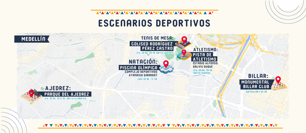 • Tenis de Mesa: Coliseo Rodríguez Pérez Castro, Cra. 48 No. 70-10, barrio Laureles, Medellín.