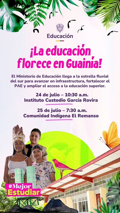Bogotá D.C, 23 de julio de 2025. Este 24 y 25 de julio, el Ministro visitará el departamento de Guainía, en la región amazónica, para compartir con las comunidades educativas, presentar los avances en materia educativa y fortalecer la estrategia Educación Superior en tu Colegio, que ya está transformando vidas en territorios históricamente olvidados como el Catatumbo y ahora también en la selva guainiana.