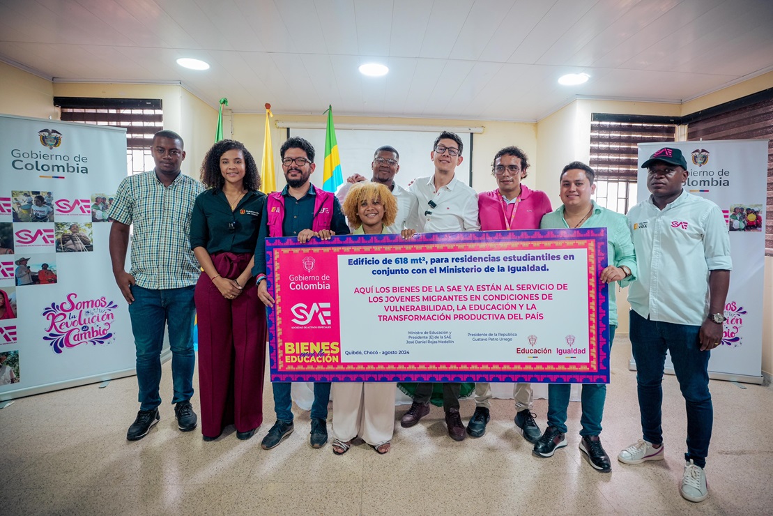 La jornada comenzó con la entrega de inmuebles proporcionados por la Sociedad de Activos Especiales (SAE). Uno de ellos fue destinado a residencias estudiantiles para la Universidad Tecnológica del Chocó. Allí se alojarán estudiantes migrantes en condiciones de vulnerabilidad y provenientes de municipios históricamente marginados. Esta medida se enmarca en el Programa para la Superación de Brechas de las Juventudes, del Viceministerio de la Juventud, que busca mejorar el acceso y la permanencia en la educación superior, así como fomentar la inclusión y reducir la discriminación.