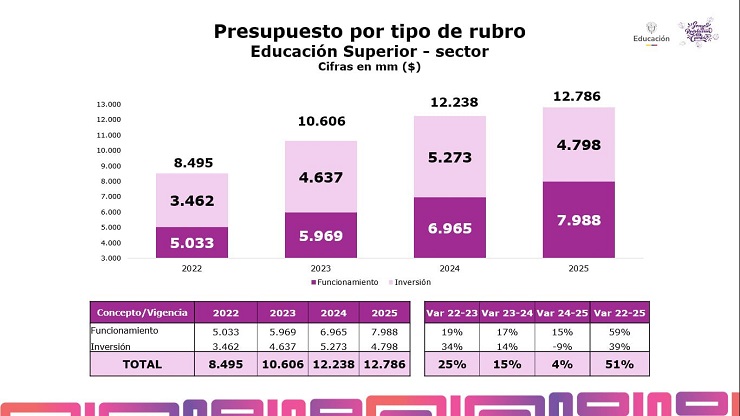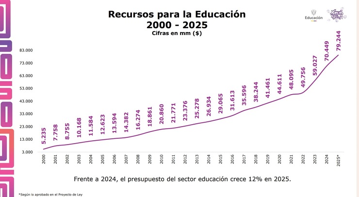 En el actual Gobierno del Cambio, el presupuesto del sector educación ha tenido un crecimiento histórico, duplicándose de $49.756 billones en 2022 a $70.499 billones para 2024, y con proyecciones de superar los $79.000 millones en 2025.