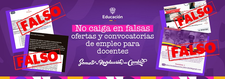 Bogotá D.C., 19 de diciembre de 2024. El Ministerio de Educación Nacional reitera la recomendación a profesionales, licenciados y ciudadanía en general de comprobar siempre a través de los canales oficiales de la entidad la veracidad de cualquier oferta de empleo, convocatoria y todo tipo de anuncios publicitarios en medios digitales, a través de los cuales se ofrecen supuestos contratos de empleo para docentes.
