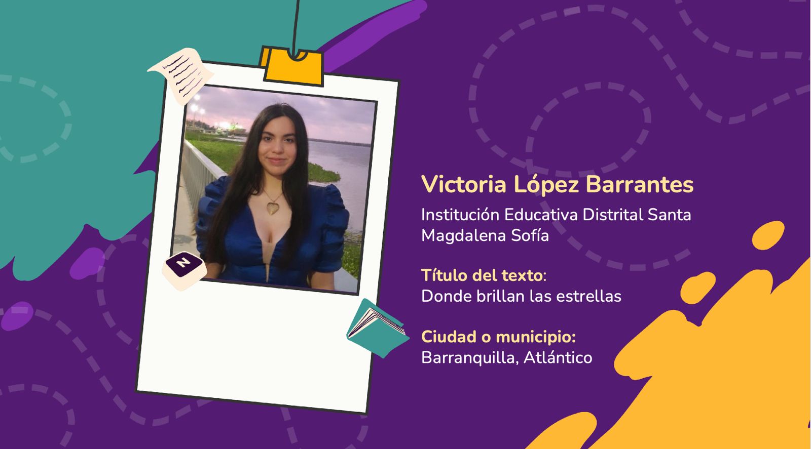 Por su parte, Victoria López Barrantes, de la Institución Educativa Distrital Santa Magdalena Sofía, ganó con su cuento 'Donde brillan las estrellas'. La historia narra el reencuentro de Mariana y Tomás, amigos de infancia separados por la guerra. Él regresa como desmovilizado, y es en el silencio compartido bajo las estrellas de su niñez donde hallan la reconciliación.