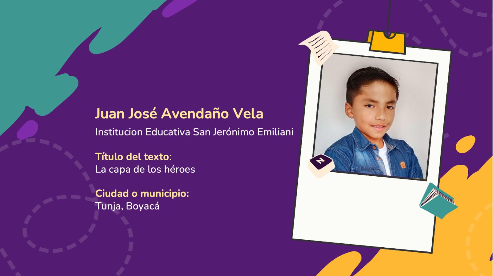 Juan José Avendaño Vela estudiante de la Institución Educativa San Jerónimo Emiliani de Tunja (Boyacá) reconocido en la categoría infantil con su cuento 'La capa de los héroes', describe a Juan José, un niño que escucha a una mujer maltratada en un bus y le ayuda para que le devuelvan su dinero. Descubre que es esposa de un empleado de su abuelo, quien interviene para ayudar. La historia resalta pequeños actos de empatía como formas de heroísmo cotidiano.