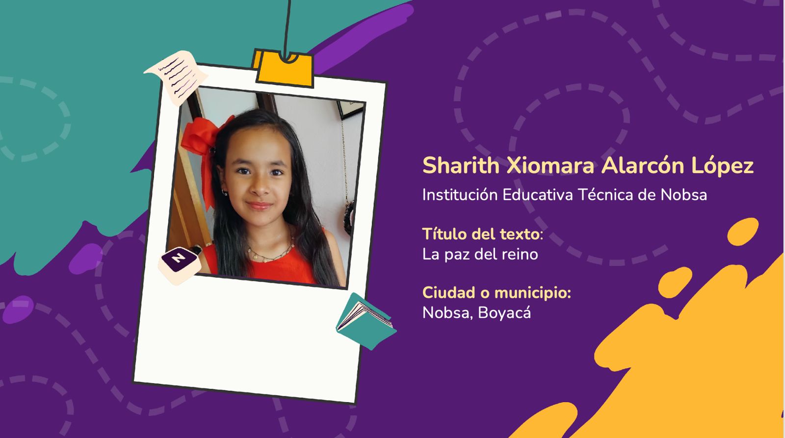 Sharith Xiomara Alarcón López estudiante de Institución Educativa Técnica de Nobsa, ubicada en Nobsa (Boyacá), destacada en la categoría infantil con su cuento 'La Paz del Reino' relata la fábula sobre Solaria (paz) y Nublia (guerra), donde niños encuentran un mapa para restaurar la armonía. Aprenden que la paz se construye con empatía y acciones concretas. La historia subraya que la paz es una elección colectiva, no un destino.