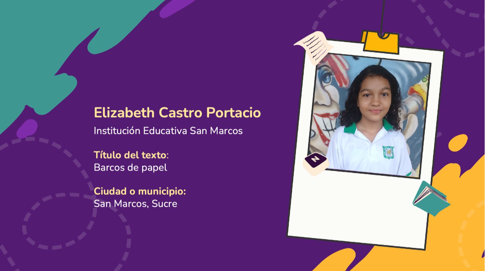 Elizabeth Castro Portacio estudiante de la Institución Educativa San Marcos en San Marcos (Sucre), recibió el reconocimiento en la categoría infantil gracias a su cuento 'Barcos de papel', la historia de Magnolia, una niña huérfana en La Mojana, que sueña con navegar y encuentra consuelo en el río tras descubrir la verdad sobre la muerte de su padre. Su abuelo le construye una canoa, simbolizando la reconciliación con su pasado. La naturaleza y los sueños sanan su dolor.