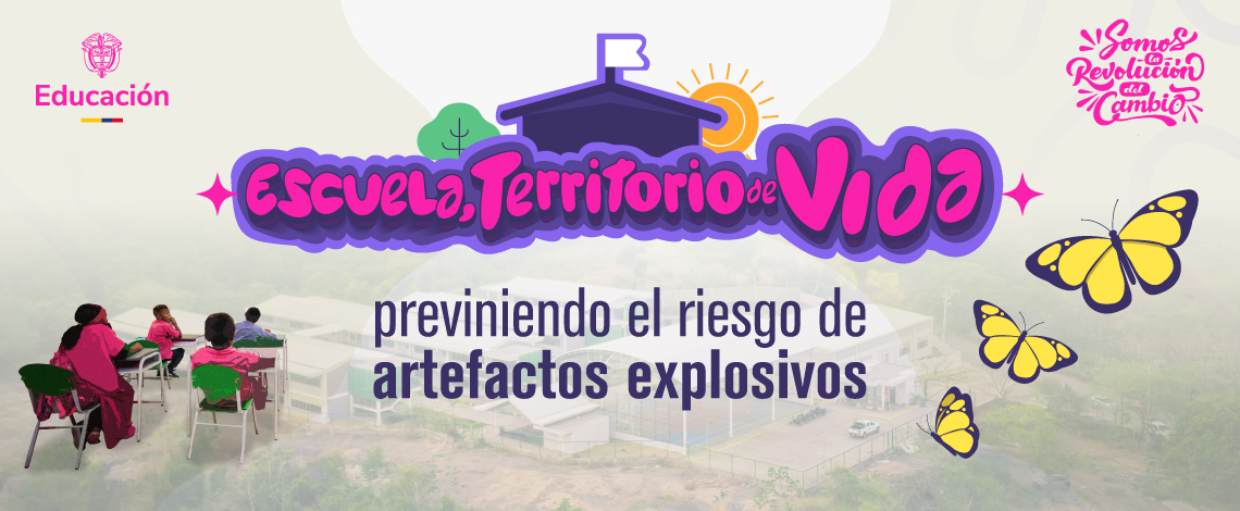 Banner de imagen que incluye un texto que dice Escuela Territorio de Vida, previniendo el riesgo de artefactos explosivosBogotá D.C., 25 de julio de 2025. Colombia ha registrado más de 12.600 víctimas por minas antipersonal desde 1990. Solo en los últimos tres años se han reportado 647 eventos relacionados con la presencia o sospecha de artefactos explosivos en inmediaciones de sedes educativas, lo que ha afectado directamente a 386 instituciones, según datos del Sistema de Información de la Acción Integral contra Minas Antipersonal de la Consejería Comisionada de Paz.