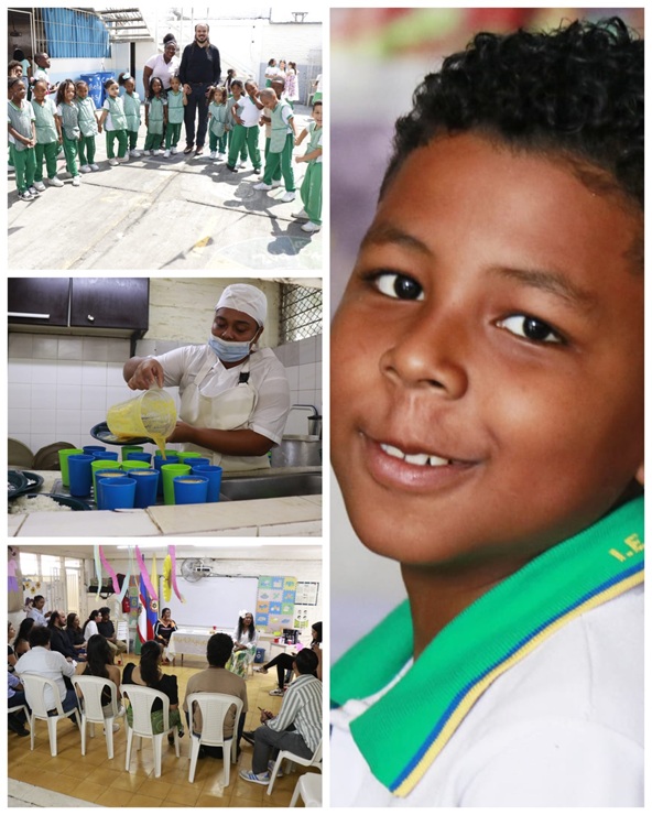 Collage de 4 fotos donde se ven reuniones en Cali, manipuladora de alimentos y niños quee hacen parte del PAEDurante estas jornadas, la delegación visitó la Institución Etnoeducativa Santa Rosa - Sede "José Cardona Hoyos", donde la coordinadora expuso mejoras sustantivas del PAE: mejor calidad y mayor aceptación de los menús, prestación del servicio desde el primer día del calendario y estabilidad laboral con salario fijo. Gracias a mejores insumos y organización, niños, niñas, jóvenes y adolescentes casi no dejan comida y las familias reconocen el valor del complemento alimentario en la escuela; según la comunidad educativa, la mejora frente a años anteriores ronda el 90 %.