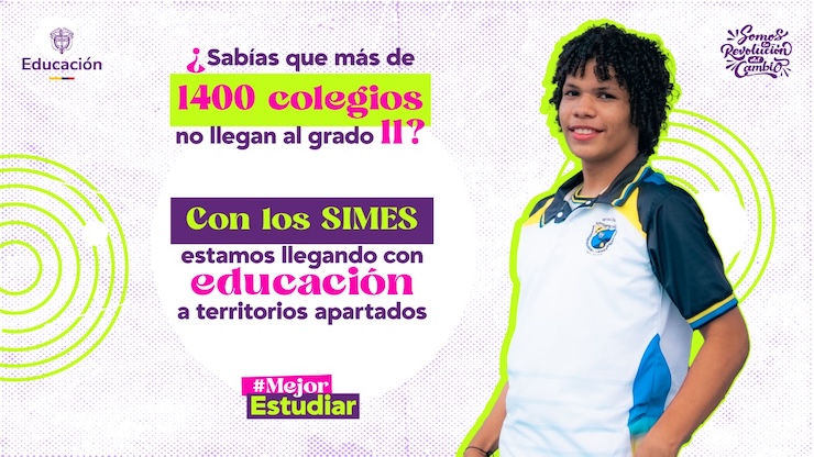 Imagen grafica con un texto que dice sabias que mas de 140 colegios no llegan al grado 11? Con los simes estamos llegando a los territorios apartados del pais_______