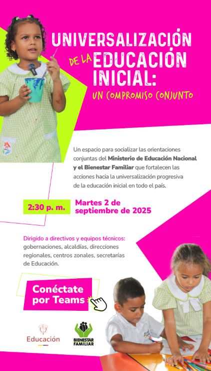 El próximo 2 de septiembre se realizará un webinar, dirigido a secretarios de educación, directivos docentes, directores regionales del ICBF y demás actores territoriales involucrados en la prestación del servicio de educación inicial, con el fin de socializar la Circular 034 de 2025, que establece las orientaciones para trabajar de manera conjunta y convergente en la universalización progresiva de la educación inicial.