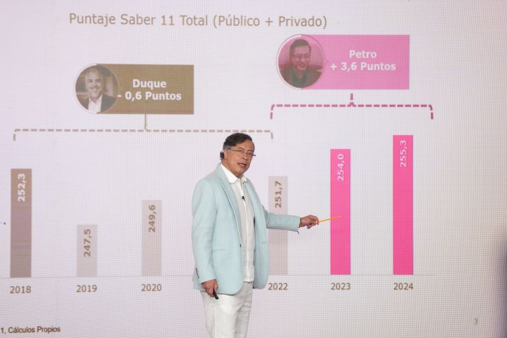 El presidente Gustavo Petro resaltó que, bajo el Gobierno del Cambio, la educación superior en Colombia ha recuperado su calidad, evidenciada en los resultados de las pruebas Saber Pro: un aumento promedio de 1,4 puntos a nivel nacional y un crecimiento de 2 puntos en las instituciones públicas.