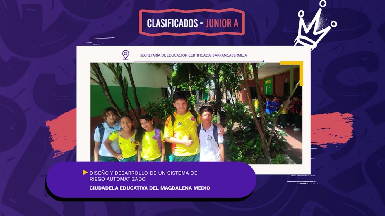 También desde Barrancabermeja, el Semillero de Investigación y Robótica Sede G, de la Ciudadela Educativa del Magdalena Medio, compite con el proyecto Diseño y desarrollo de un sistema de riego automatizado, una propuesta que aplica la robótica y la programación para optimizar el uso del agua en cultivos locales.