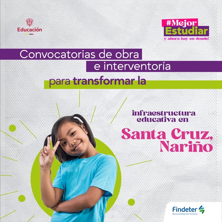 El Ministerio de Educación Nacional a través de Findeter anuncian la apertura de dos convocatorias públicas que suman más de $4.400 millones, destinadas a mejorar de manera integral varias instituciones educativas oficiales en el municipio de Santa Cruz, subregión de Abades, en el departamento de Nariño, como parte del Programa Maqueta de Paz.