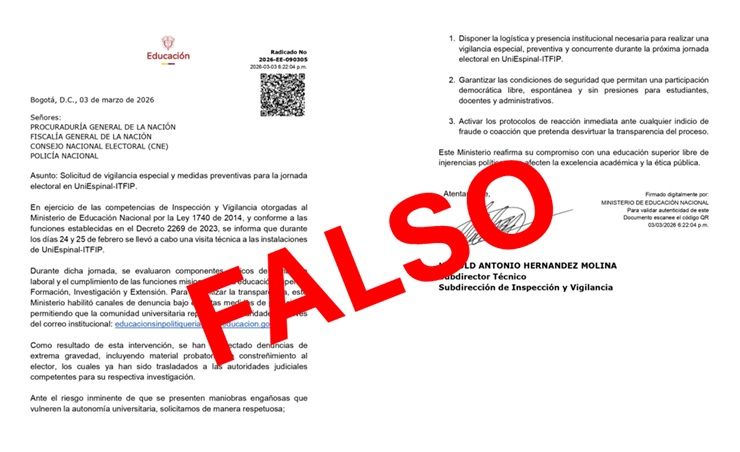 La supuesta comunicación que fue emitida a UniEspinal, antes Instituto Tolimense de Formación Técnica Profesional, ITFIP, hace parte de un documento no oficial, que contiene información que puede generar confusión entre estudiantes, docentes, instituciones educativas y a la opinión pública en general. Ante esta situación el Ministerio hace un llamado a verificar siempre la autenticidad de las comunicaciones a través de los canales oficiales.