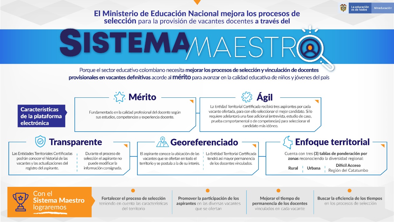 Para ello, desde el Gobierno Nacional se diseñó "Sistema Maestro", una plataforma que permite seleccionar a los maestros bajo criterios de mérito, fundamentado en la calidad profesional, sus estudios y experiencia docente, promoviendo la participación de los aspirantes para las diversas vacantes que se ofertan.
