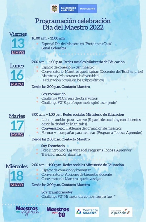 Bogotá D.C., mayo 13 de 2022. Con foros, conversatorios, espacios de encuentro y bienestar programados desde este viernes 13 hasta el miércoles 18 de mayo, el Ministerio de Educación Nacional celebra el Día del Maestro y reconoce la labor de los líderes inspiradores y transformadores del país.