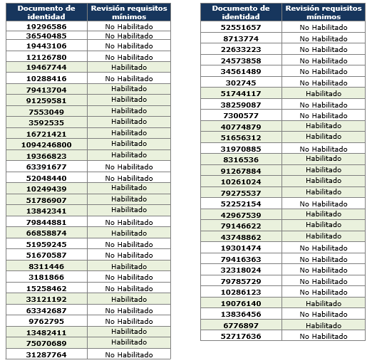 La revisión de los documentos se realizó de acuerdo a los criterios establecidos en la convocatoria. Solamente fueron tenidas en cuenta aquellas experiencias debidamente certificadas, acorde con las características establecidas en la Nota 2 de la sección Proceso de Aplicación.