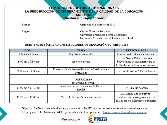 La Subdirección de Aseguramiento de la Calidad de la Educación Superior invita a las IES a la asistencia técnica y capacitación en normas e instrumentos para el ejercicio del Par Académico y uso de la plataforma SACES en la ciudad de Cúcuta.