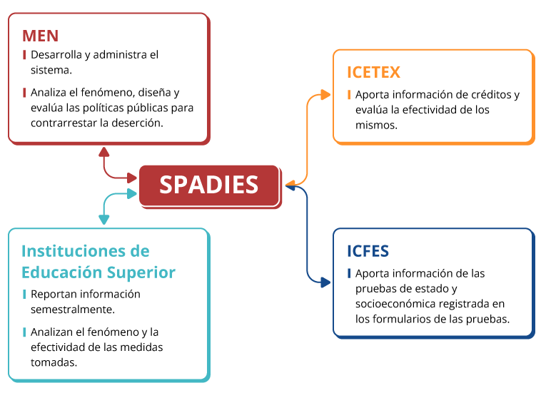 El SPADIES centraliza información proveniente de diferentes fuentes del sector que han resultado tener incidencia en la probabilidad de que un estudiante permanezca o no dentro del trayecto académico.