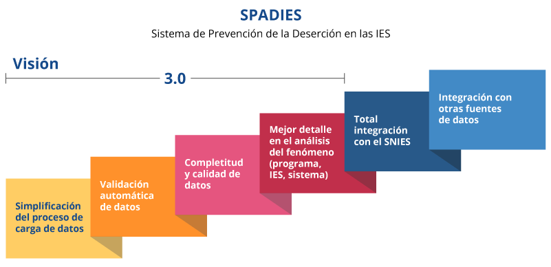 Durante su evolución, la integración SNIES-SPADIES ha surtido ya varias etapas en los proceso de carga y consolidación de la información, lo que ha permitido avanzar en la optimización de procesos y en la medición más precisa del fenómeno para todo el Sistema de Educación Superior. Lo anterior, teniendo en cuenta que el SPADIES 3.0 permite identificar a los desertores a nivel de programa, a nivel de Institución y finalmente a los desertores a nivel de todo el sistema de educación superior, teniendo una medición más precisa del abandono de estudios a nivel país. Este proceso de integración continua en desarrollo y espera culminar con la integración total las bases externas.