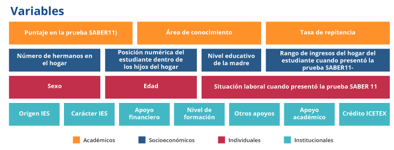 Estas variables hacen referencia a algunas condiciones que acompañan al individuo como son su edad, género, el contexto socioeconómico que lo acompaña, la composición de su núcleo familiar, las condiciones académicas al ingresar a la educación superior, entre otras. Las siguientes son las variables que se tienen en cuenta para la caracterización del fenómeno: