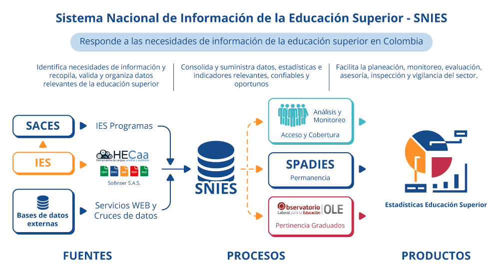Durante los primeros años de operación, el Sistema cargaba la información de las diferentes fuentes externas, incluido el reporte de matrícula de las IES, de manera paralela al SNIES. A partir del 2017 todos los procesos de carga se integran en un gran y único proceso bajo el Sistema Nacional de Información de la Educación Superior SNIES, reduciendo de esta manera tiempos, desgates administrativos y optimizando la calidad del reporte, así como la oportunidad de la producción estadística del sector.